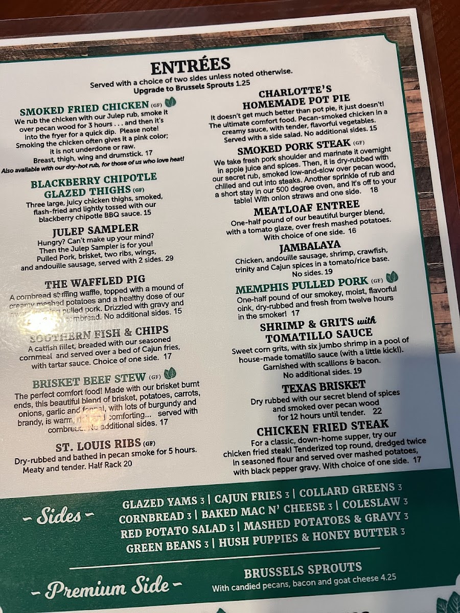 Satisfy your sweet tooth with dessert options like the Alabama Stack Cake or homemade Apple Crisp, both crafted to perfection. Julep's drinks menu offers curated draft beers, enhancing the dining experience. The standout dishes, such as the smoky fried chicken and inventive blackberry chipotle chicken thighs, coupled with stellar service, provide an inviting atmosphere for families and friends alike. The freshness and portion sizes exemplify why Julep is becoming a local favorite—come hungry and leave happy!