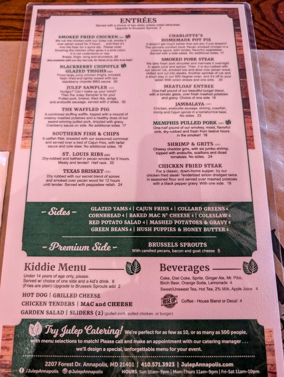 At Julep Kitchen & Bar, located in Annapolis, Maryland, a culinary journey through Southern comfort food awaits. The menu balances traditional favorites with creative twists, showcasing dishes that resonate with heart and flavor. Start your brunch with the Cream of Crab, a delicious homage to Chesapeake cuisine, or the vibrant Roasted Beet Salad, bursting with freshness and texture.